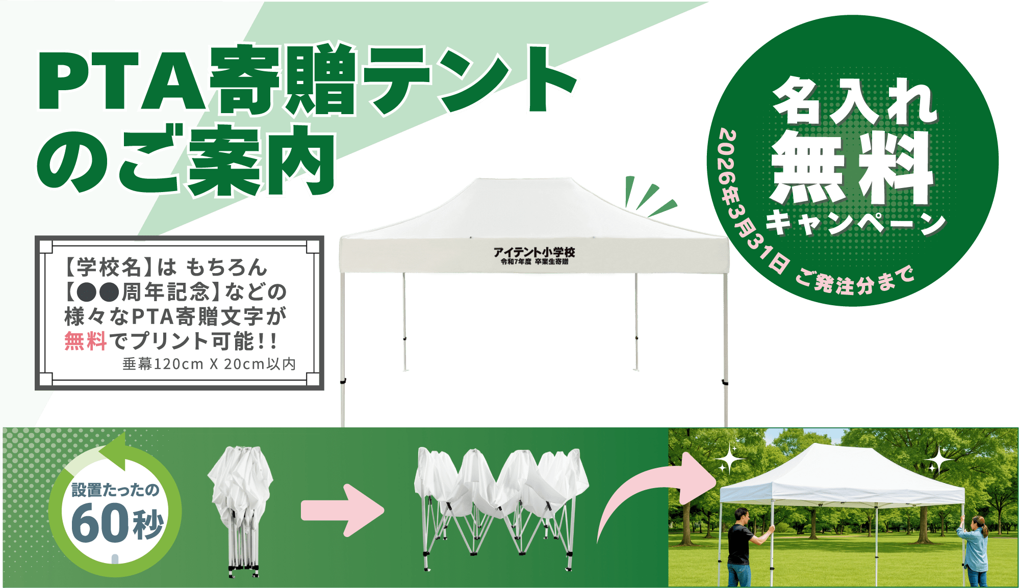 期間限定価格 テント+名入れ込み (税込) | 88,000円(税込:96,800円) | 104,000円(税込114,400円) | 136,000円(税込149,600円) |